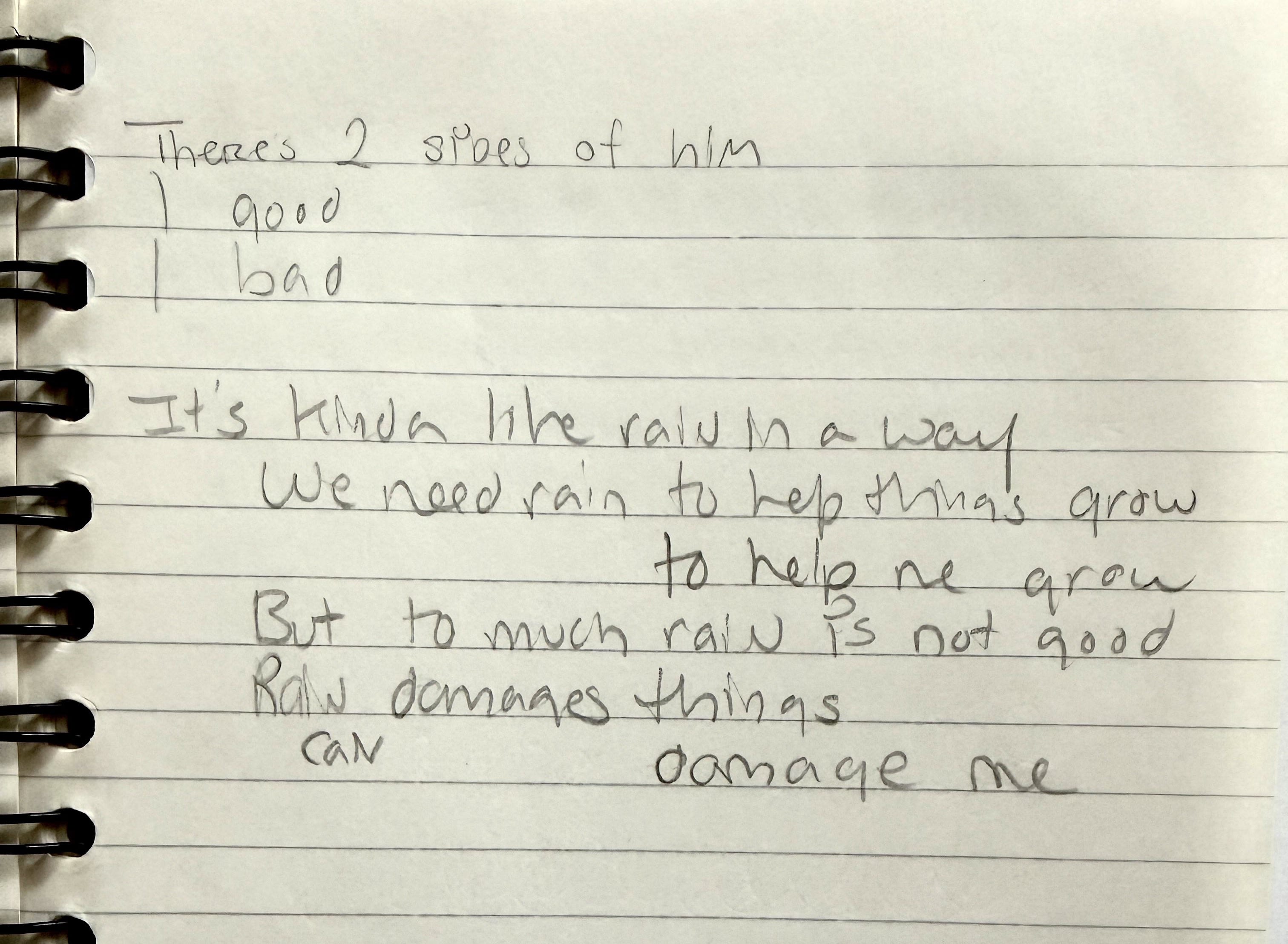 there are two sides of him one good one bad its kinda like rain in a way we need rain to help things grow to help me grow but too much rain is not good rain can damage things damage me